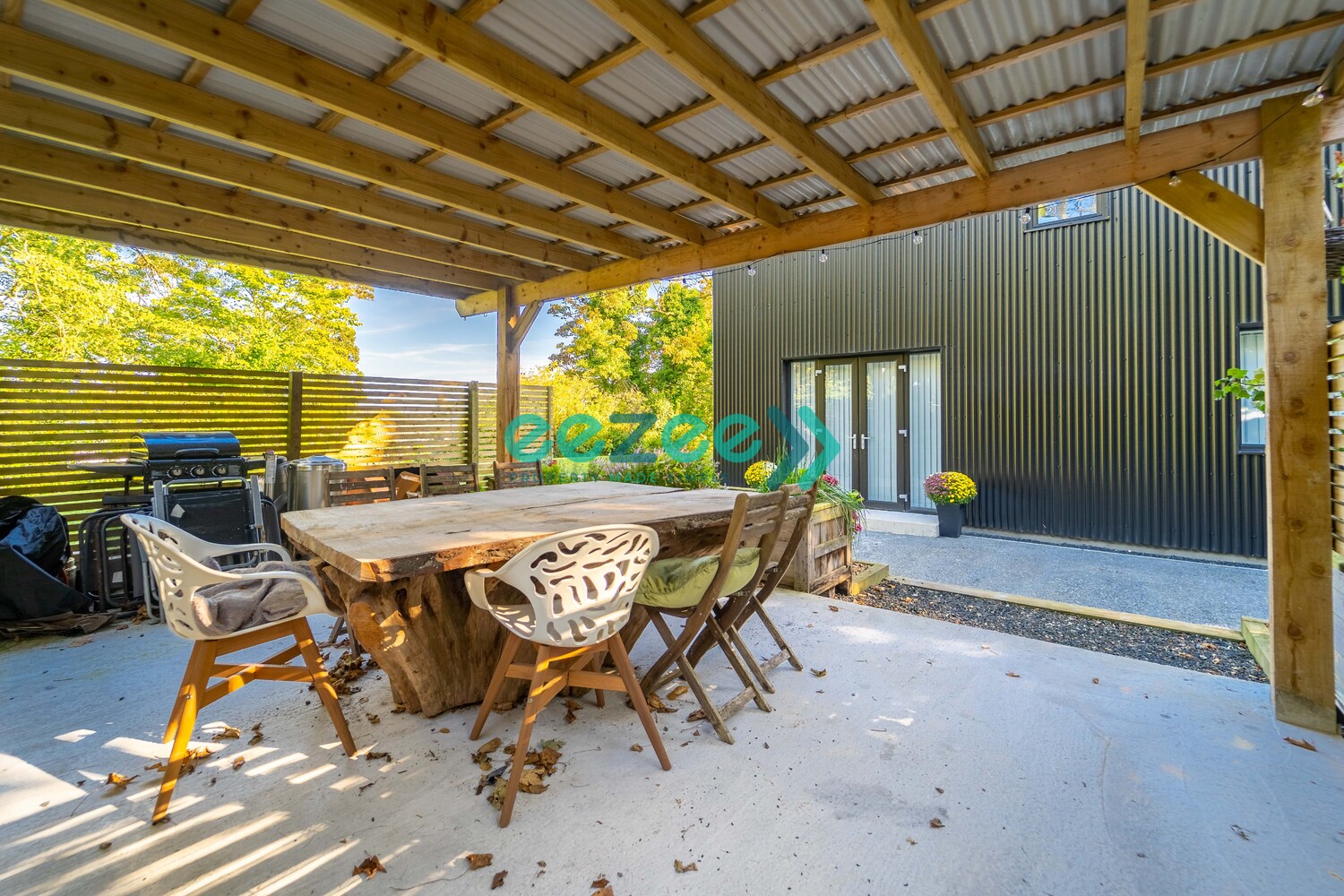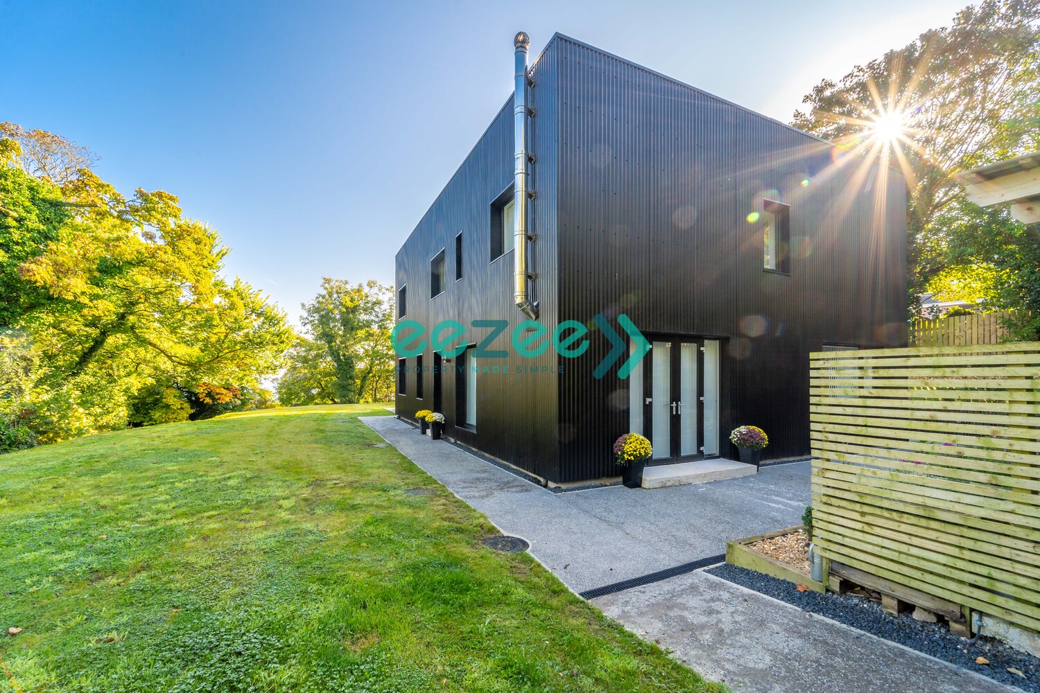 There is a full length black plastic-coated corrugated cladding surrounding two thirds of the house, supplied by BeFab. The cladding is cleverly designed to hide Services, Soil and Rainwater Pipes.