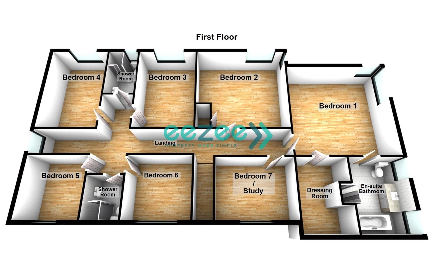 The first Floor comprises Seven double Bedrooms or Six Double Bedrooms plus a Study / Home Office, the Primary Bedroom benefiting from stunning Sea Views, an Ensuite Bathroom and a walk-in Wardrobe and a three-piece Shower Room Suite.